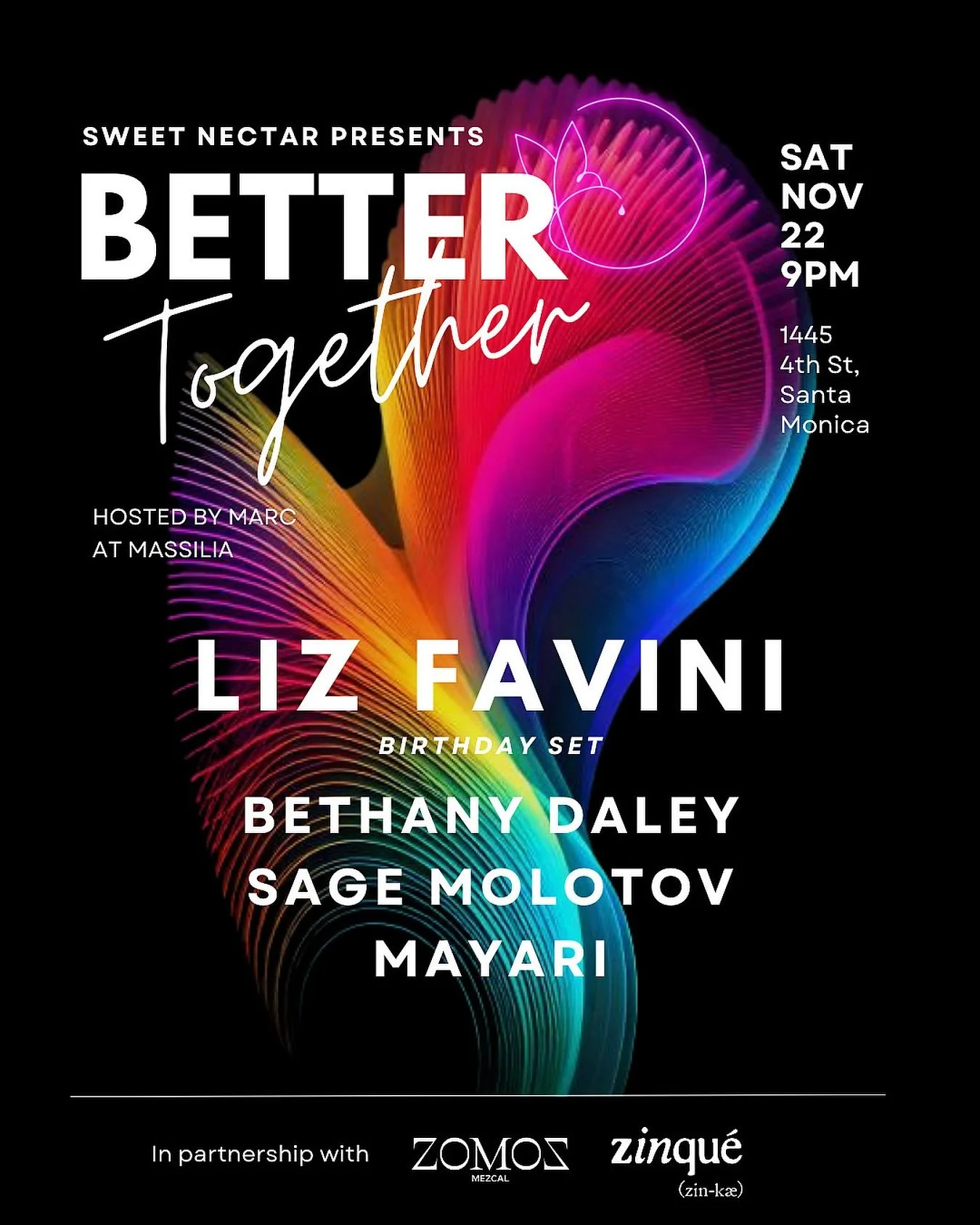 Sweet Nectar Parties have earned an outstanding local reputation for a high-vibe scene, creating a safe space where individuals can express themselves creatively and feel a sense of belonging. They collaborate with other local DJs and collectives to create immersive music and dance experiences. Dedicated to nurturing a vibrant community on LA's Westside and beyond, they are thrilled to continue contributing positive energy of the electric music scene.